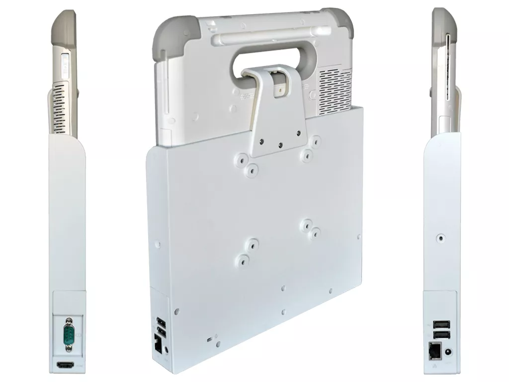 The RX medical tablet comes with a VESA Mounting Bracket with the standard VESA mount options. The VESA mount has two USB ports, an RS232 port, a NIC port, HDMI and a DC Jack. You can mount your medical tablet on a mobile cart, wall or on any surface that works with the standard VESA holes option.