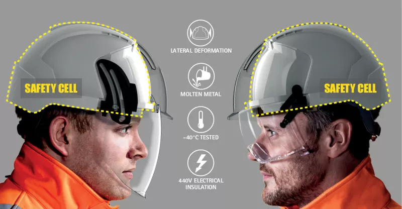 The safety cell concept prevents ricocheting debris travelling up the eyewear and impacting the scalp. In addition, the eyewear cannot make contact with the scalp, preventing injury should the eyewear be forced back on to the safety cell. Ideally suited to Shotcrete workers, mining conveyor service teams and scaffolders.