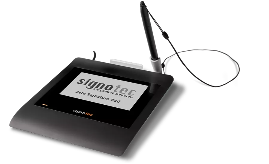 Like all other models, the signotec Zeta signature pad of the signotec family was developed completely “Made in Germany”. The device has an approx. 4.5“ (11.4 cm) large monochrome display and the popular, long-lasting ER technology.
