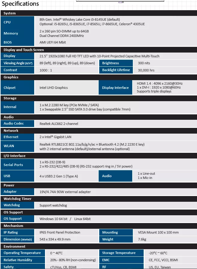 Shuttle P21WL01 is a high-value, sturdy Panel PC equipped with a 21.5-inch Full HD TFT LED with true-Flat PCAP touch. The unit is designed with Intel® Whiskey Lake-U technology to provide high-performance computing in a fan-less system for high durability and functionality.